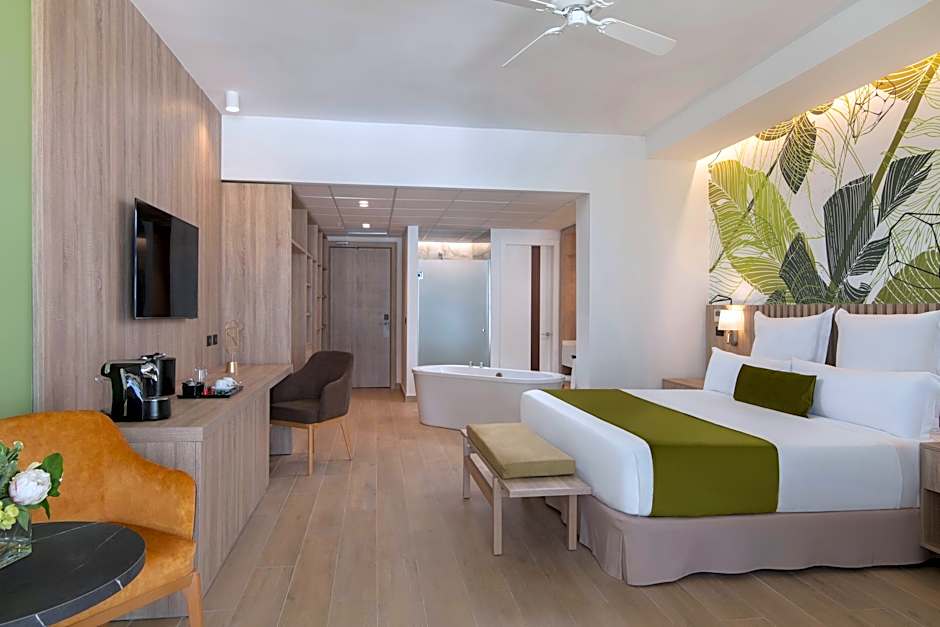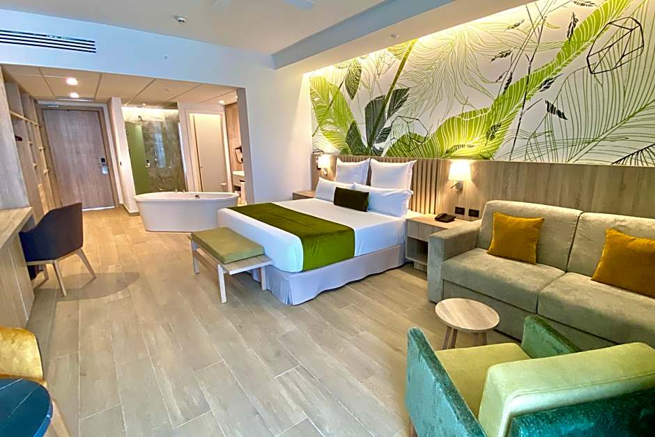 JUNIOR SUITE SWIM OUT GARDEN VIEW 1 ADULT is 527 square feet and includes a king-size bed 150-183 width plus a sofa bed plus terrace, hairdryer, safe, and slippers and is Wheelchair-accessible.